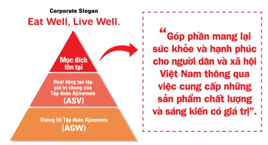 Từ Mô hình triết lý mới của Tập đoàn, cũng như nhằm khẳng định nguyên tắc kinh doanh bền vững của Công ty, đó là luôn kiên trì đóng góp cho các hoạt động tạo ra giá trị xã hội nhằm góp phần nâng cao hạnh phúc và sức khỏe cho người dân và xã hội Việt Nam, Ajinomoto Việt Nam đã xác lập Mô hình triết lý mới trong đó nhấn mạnh “Mục đích tồn tại” là: “Góp phần mang đến sức khỏe và hạnh phúc cho người dân và xã hội Việt Nam thông qua việc cung cấp những sản phẩm chất lượng và sáng kiến có giá trị”.