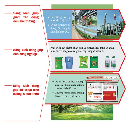Ajinomoto Việt Nam luôn nỗ lực không ngừng để mang đến các sản phẩm chất lượng tốt, phù hợp khẩu vị và nhu cầu của người tiêu dùng. Bên cạnh hoạt động sản xuất kinh doanh, Công ty đã và đang không ngừng đẩy mạnh các sáng kiến giá trị giúp mang lại cuộc sống tốt đẹp hơn cho thế hệ hôm nay và mai sau (Xem hình vẽ).