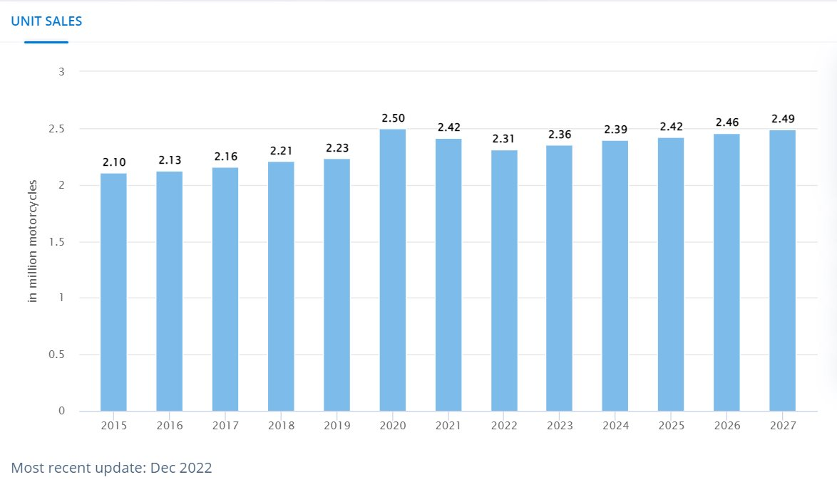Xét về doanh số, lượng xe đạp bán ra tại Việt Nam dự kiến sẽ đạt 2,49 triệu chiếc vào năm 2027. Trong khi đó trên thế giới, phần lớn doanh thu sẽ được tạo ra ở Trung Quốc, đứng thứ 2 là Mỹ và Đức xếp thứ 3.