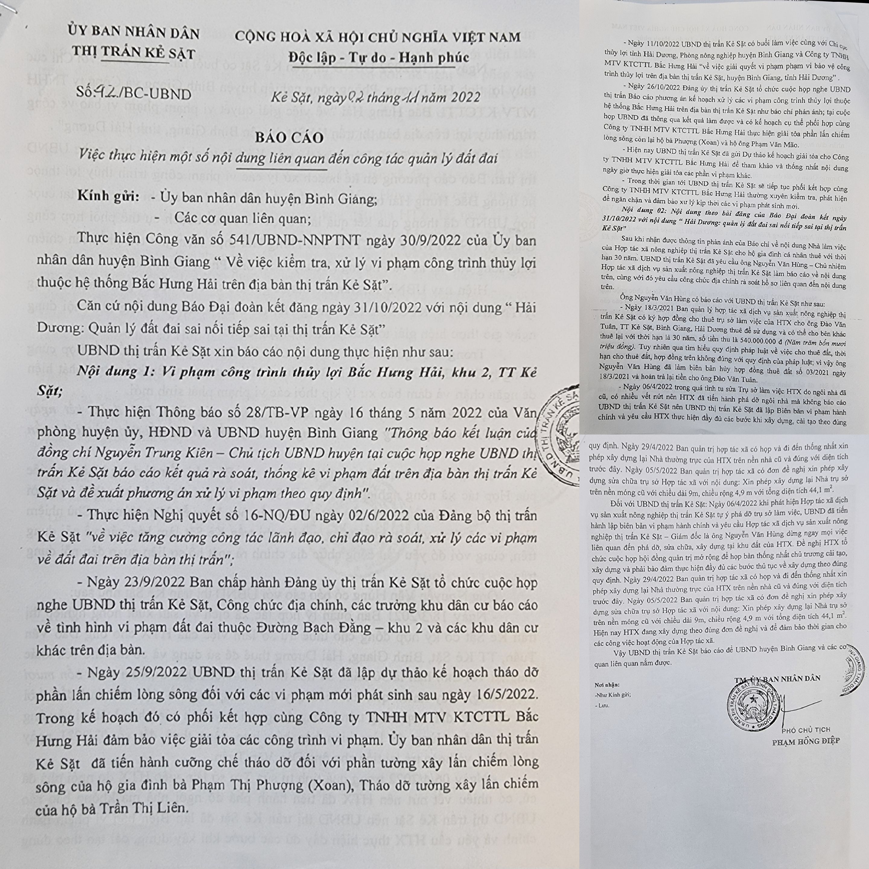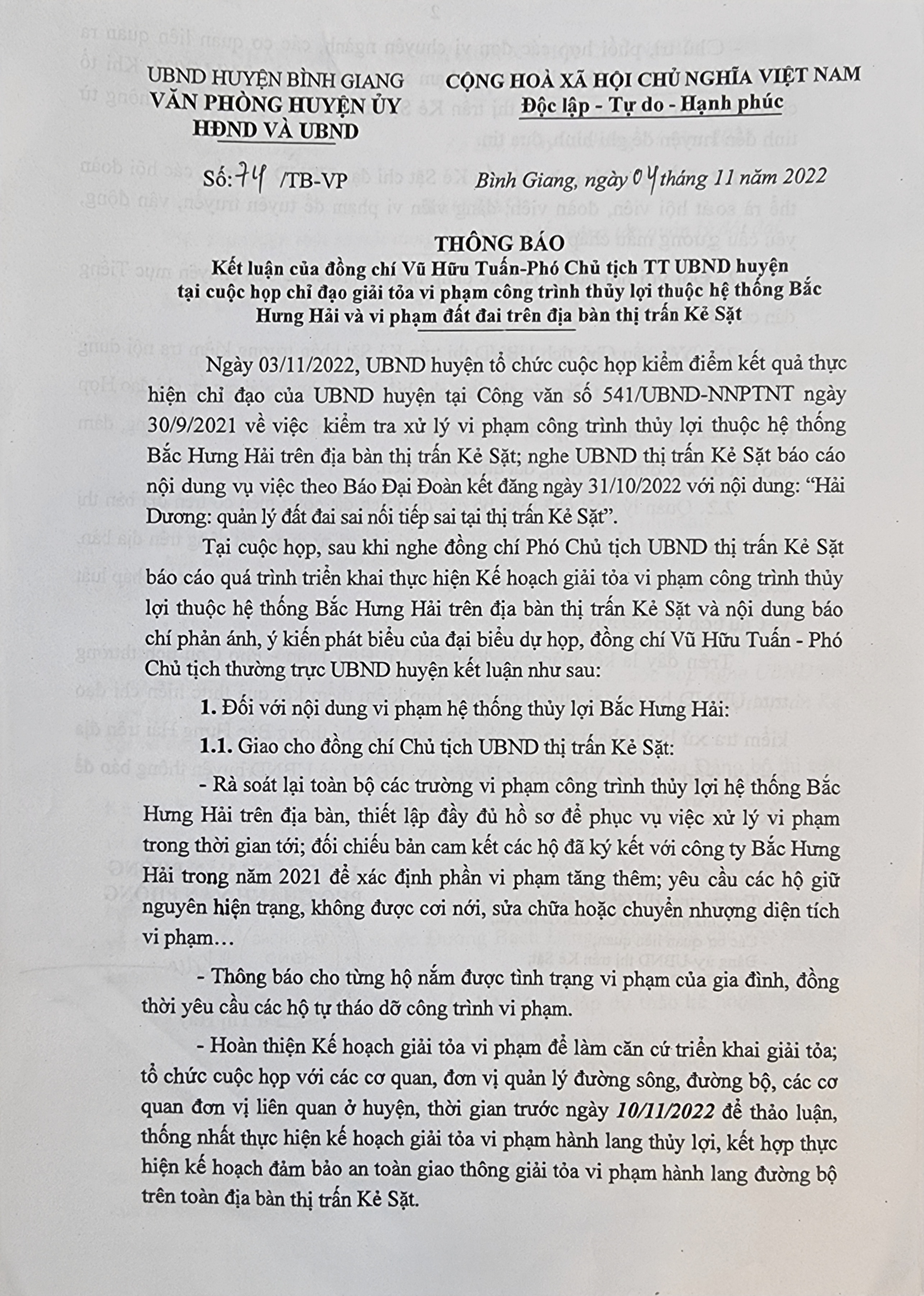 Đối với các công trình xây dựng trái phép vi phạm công trình thủy lợi Bắc Hưng Hải, khu 2, thị trấn Kẻ Sặt, ngày 4/11/2022, UBND huyện Bình Giang đã thông báo kết luận số 74/TB-VP của ông Vũ Hữu Tuấn, Phó Chủ tịch Thường trực UBND huyện.