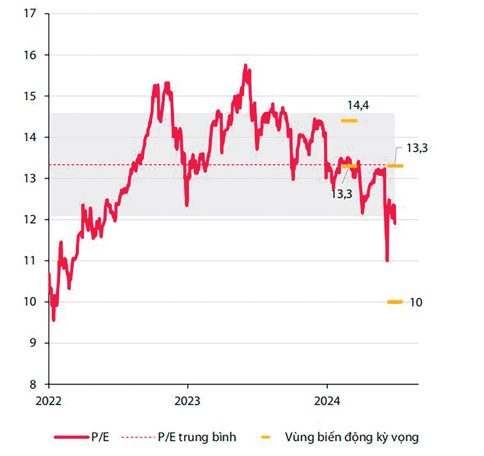P/E của VN-Index từ năm 2022 đến nay và vùng biến động mục tiêu. Nguồn: VDSC