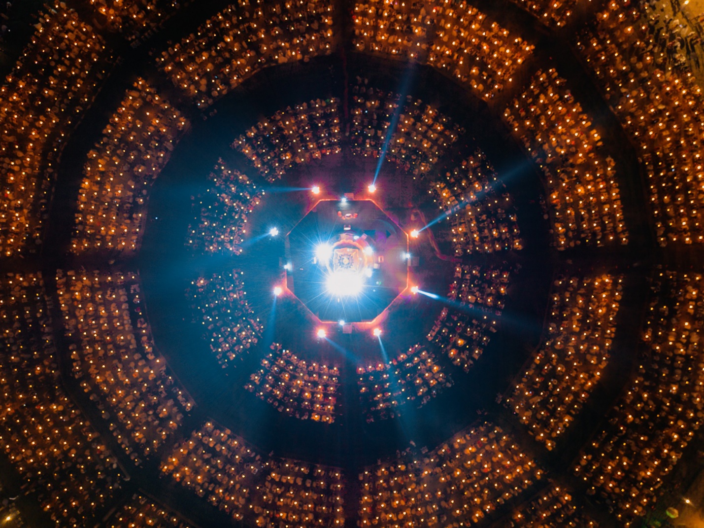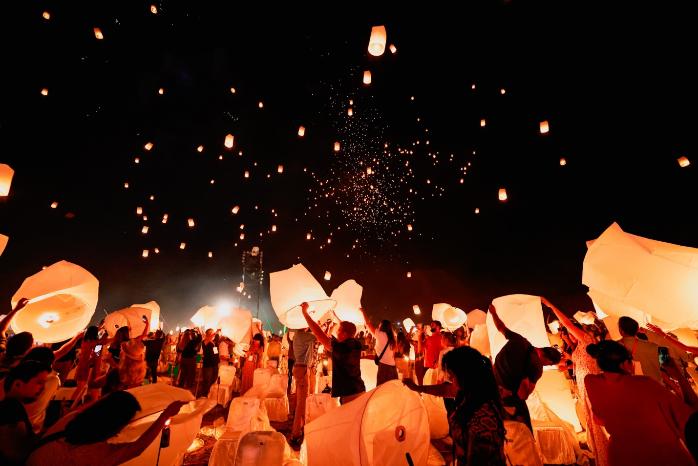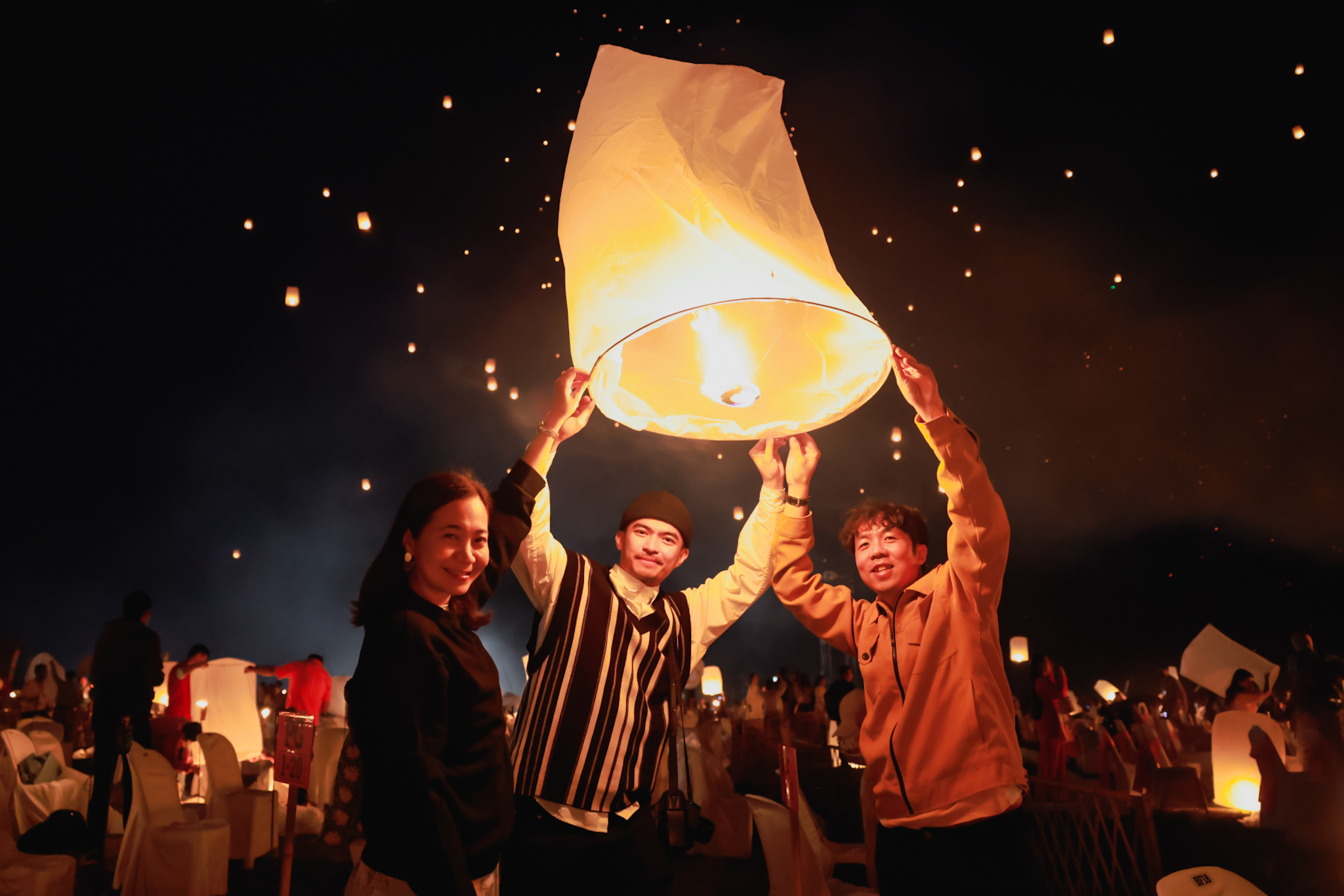 Bầu trời đêm rực sáng với muôn ngọn lửa lơ lửng, những chiếc đèn trắng muốt theo gió cuốn lên cao mãi rồi chỉ còn một chấm lấp lánh như sao, khoảnh khắc giao thoa huyền diệu khiến ai đứng trong không gian ấy cũng không khỏi hân hoan và choáng ngợp.