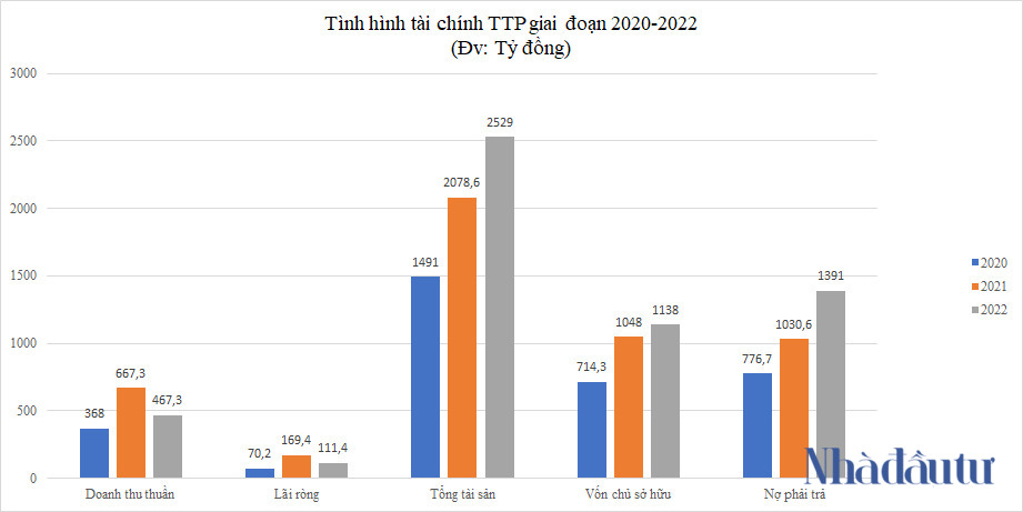 Trên bảng cân đối kế toán, tổng tài sản TTP tại ngày 31/12/2022 là 2.529 tỷ đồng, tăng hơn 21,6% so với số đầu kỳ; Vốn chủ sở hữu 1.138 tỷ đồng, tăng 8,6%; Nợ phải trả 1.391 tỷ đồng, tăng gần 35%.