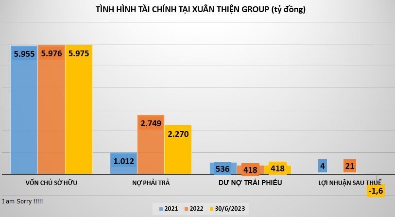 Về tình hình tài chính, tại thời điểm 30/6/2023, vốn chủ sở hữu của Xuân Thiện Group đạt hơn 5.974 tỷ đồng, giảm khoảng 2 tỷ đồng so với đầu năm. Hệ số nợ/vốn chủ sở hữu là 0,38 lần, tương ứng với số nợ phải trả là 2.270 tỷ đồng. Trong đó, dư nợ trái phiếu ở mức 418 tỷ đồng. Như vậy, tổng tài sản của Xuân Thiện Group đạt 8.244 tỷ đồng.