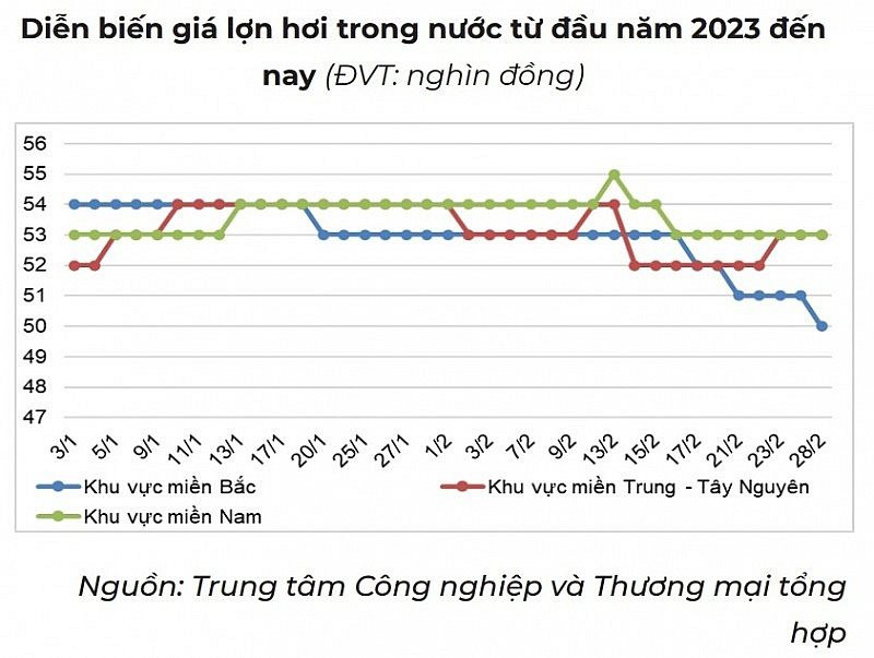 Trong tháng 2/2023, giá heo hơi tại các tỉnh, thành phố trên cả nước vẫn khá trầm lắng, giá dao động trong khoảng 48.000 - 53.000 đồng/kg, giảm từ 1.000 - 3.000 đồng/kg so với cuối tháng 1/2023.