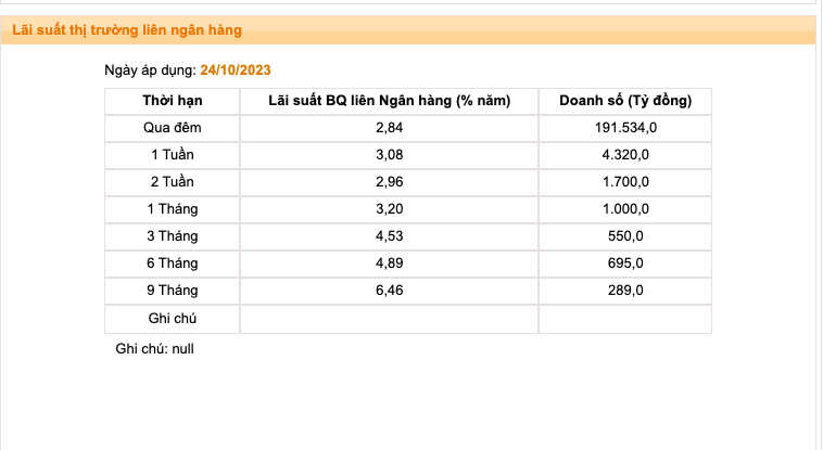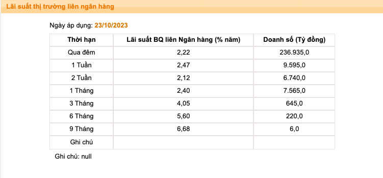 Tại ngày 20/9/2023, trước khi Ngân hàng Nhà nước kích hoạt trở lại kênh tín phiếu nhằm hút bớt tiền đồng khỏi hệ thống, lãi suất VND liên ngân hàng qua đêm ở mức 0,16%/năm.