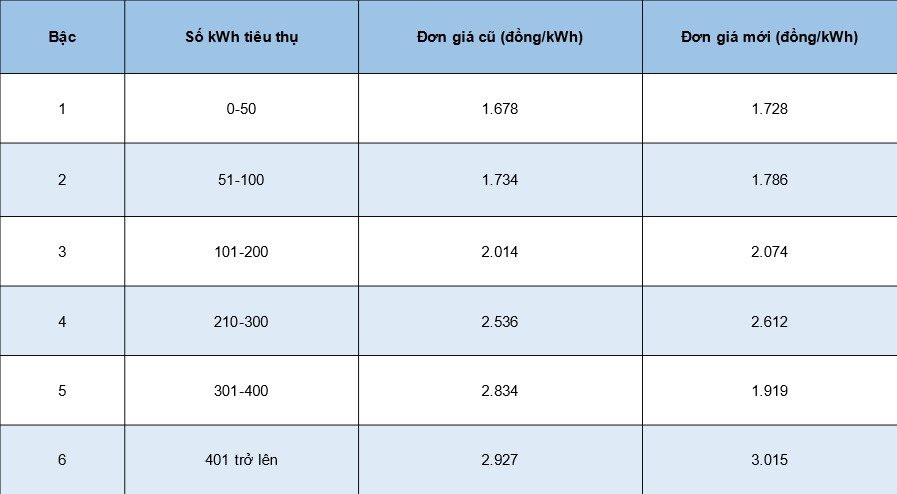 Bên cạnh đó, từ ngày 4/5, bảng giá điện sinh hoạt cũng tăng 3% với mức thấp nhất là 1.728 đồng/kWh, cao nhất 3.015 đồng/kWh tăng lần lượt 50-88 đồng/kWh so với giá cũ. Giá điện tăng kết hợp với nắng nóng kéo dài khiến nhiều người dự báo hóa đơn tiền điện những tháng tiếp theo có thể còn tăng mạnh hơn.