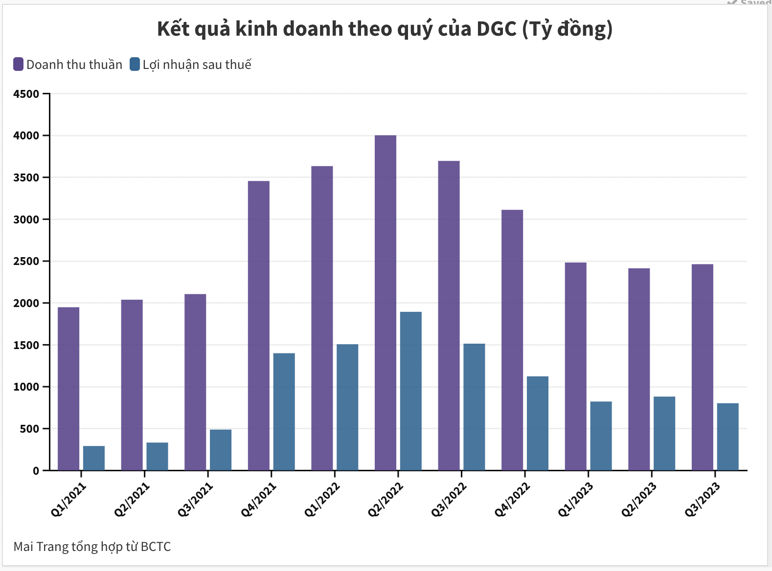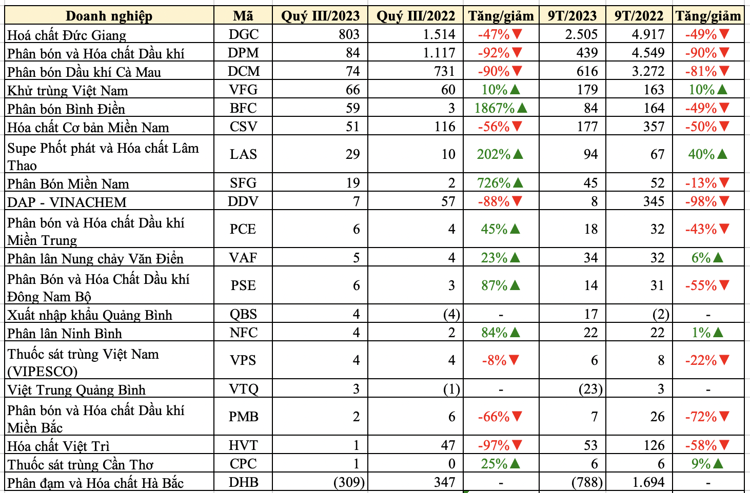Một doanh nghiệp lớn khác ngành hoá chất là Hóa chất Đức Giang cũng ghi nhận lợi nhuận giảm mạnh tới 47%. Tuy nhiên, đơn vị này ghi nhận lợi nhuận sau thuế lớn nhất ngành với 803 tỷ đồng. Mức lãi này chỉ thấp hơn cùng kỳ năm 2022, khi xảy ra “cơn sốt” hàng hoá hoá chất toàn cầu. Nếu so với các quý trước năm 2022, mức lợi nhuận của quý III vẫn khá lạc quan.