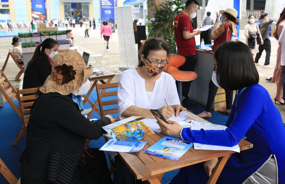 Nhân viên Công ty Vietravel (Chi nhánh Hà Nội) tư vấn các tour du lịch cho khách hàng. Ảnh: Đỗ Tâm