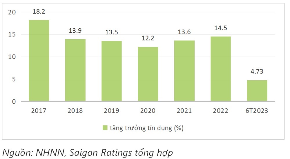 Trong 6 tháng đầu năm 2023 tăng trưởng tín dụng chậm lại so với các năm trước. Tín dụng tăng trưởng chậm do một số nguyên nhân như nền kinh tế tăng trưởng chậm, tổng cầu giảm, thị trường tài chính và đặc biệt thị trường bất động sản (BĐS) suy yếu, hoạt động sản xuất giảm tốc do sự suy giảm từ các thị trường xuất khẩu chính, cộng hưởng bởi lãi suất cho vay cao làm giảm nhu cầu tín dụng. Thậm chí cả doanh nghiệp FDI cũng gặp nhiều khó khăn, doanh nghiệp vừa và nhỏ lại càng khó tiếp cận vốn tín dụng do khả năng trả nợ không đảm bảo.