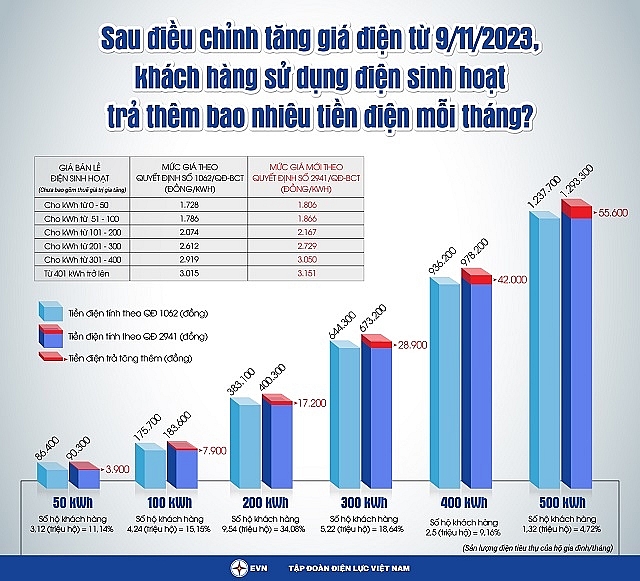 | Tăng giá bán điện: Các nhóm khách hàng phải trả thêm bao nhiêu tiền? Theo tính toán của EVN, đối với khách hàng sử dụng điện sinh hoạt, sau khi điều chỉnh giá điện, ở bậc 1 (0-50 kWh), khách hàng sẽ thanh toán tiền điện tăng thêm tối đa 3,900 đồng/kWh; bậc 2 (51-100 kWh) tăng thêm tối đa 7,900 đồng/kWh; bậc 3 (101-200 kWh) tăng thêm tối đa 17,200 đồng/kWh; bậc 4 (201-300 kWh) tăng thêm tối đa 28,900 đồng/kWh; bậc 5 (301-400 kWh) tăng thêm tối đa 42,000 đồng/kWh; bậc 6 (từ 401 kWh trở lên) tăng thêm tối đa 55,600 đồng/kWh. Đối với khách hàng kinh doanh dịch vụ (có 547,000 khách hàng), trung bình mỗi tháng sẽ trả thêm 230,000 đồng/tháng; khách hàng sản xuất (có khoảng 1.9 triệu khách hàng) bình quân mỗi tháng trả thêm 423,000 đồng/tháng; khách hàng hành chính sự nghiệp (có 681,000 khách hàng) sẽ trả thêm 90,000 đồng/tháng.