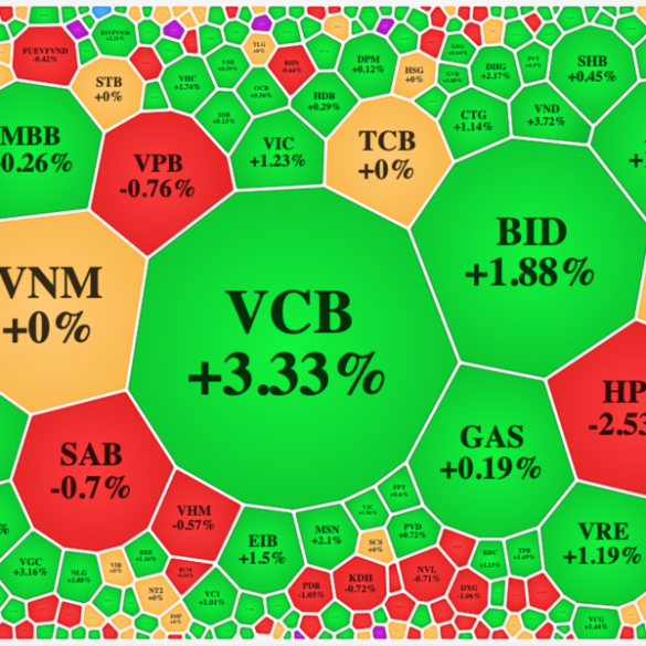 Cùng đóng góp cho đà tăng hôm nay của VN-Index chính là nhóm cổ phiếu vua, đơn cử VCB tăng 3,33%, CTG tăng 1,14%, BID tăng 1,88%, MBB tăng 0,26%, ACB tăng 1,96%,….thậm chí nhóm này còn ít cổ phiếu giảm giá hơn bất động sản.